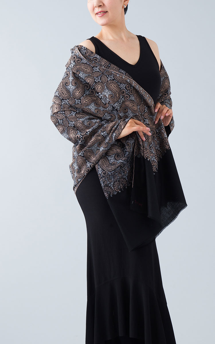 これほど刺繍が施されているとショールに重厚感が生まれ、 一級品としての品格を備えたストールの王様とも言っても過言ではないでしょう。 |