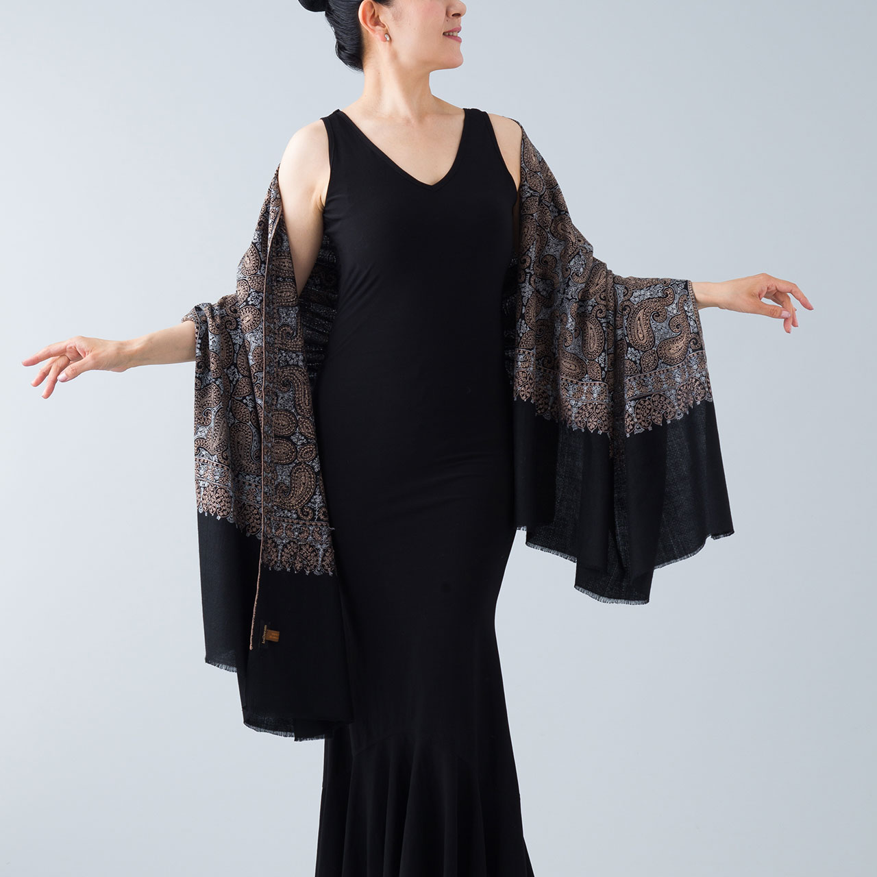 | カラー/素材 | 生地:黒 刺繍糸:ブラウン グレー カシミヤ(パシュミナ) 100% |