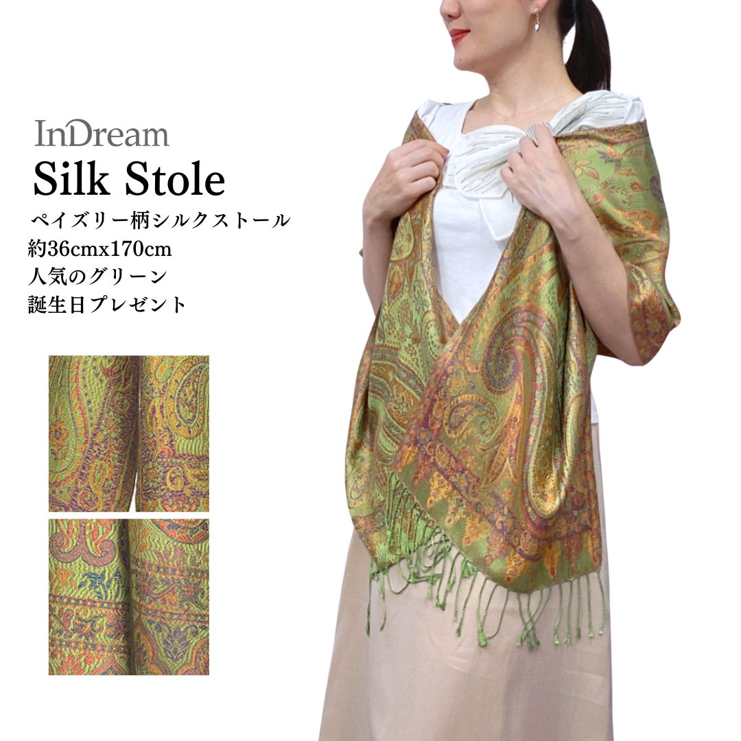 InDream ペイズリー柄 シルク ストール 小判 [36cmx170cm] グリーン オレンジ 春 秋冬 クリスマス ギフト おしゃれ 誕生日 プレゼント 50代 60代 70代 80代
