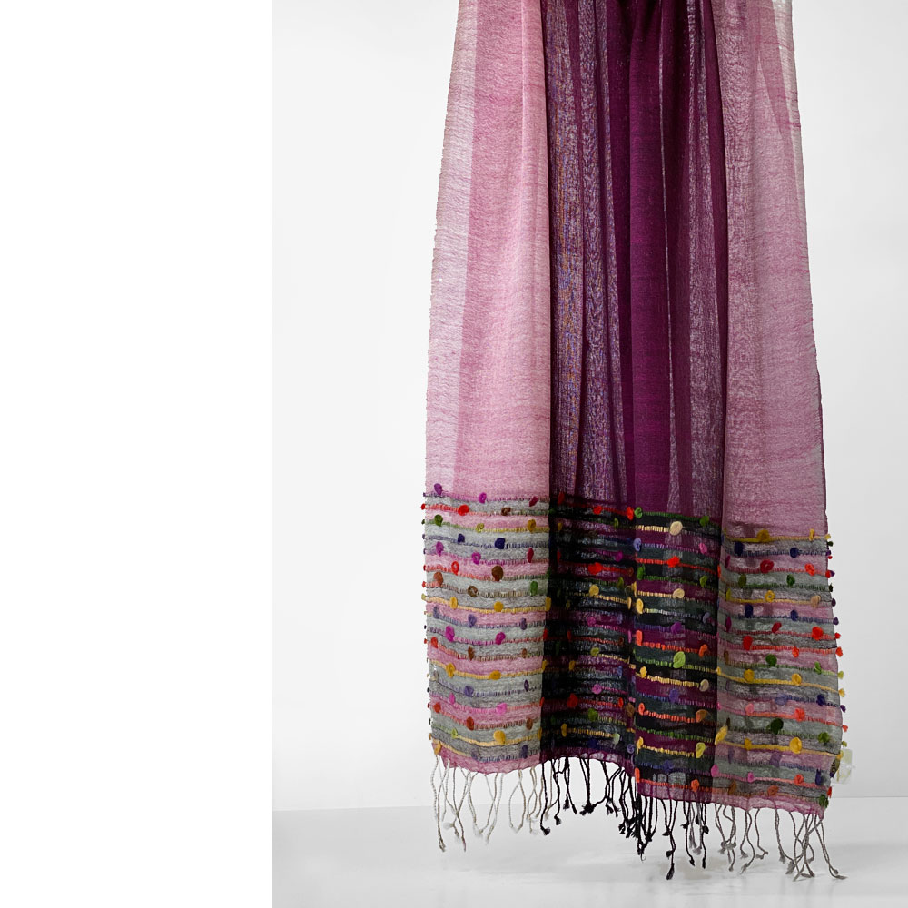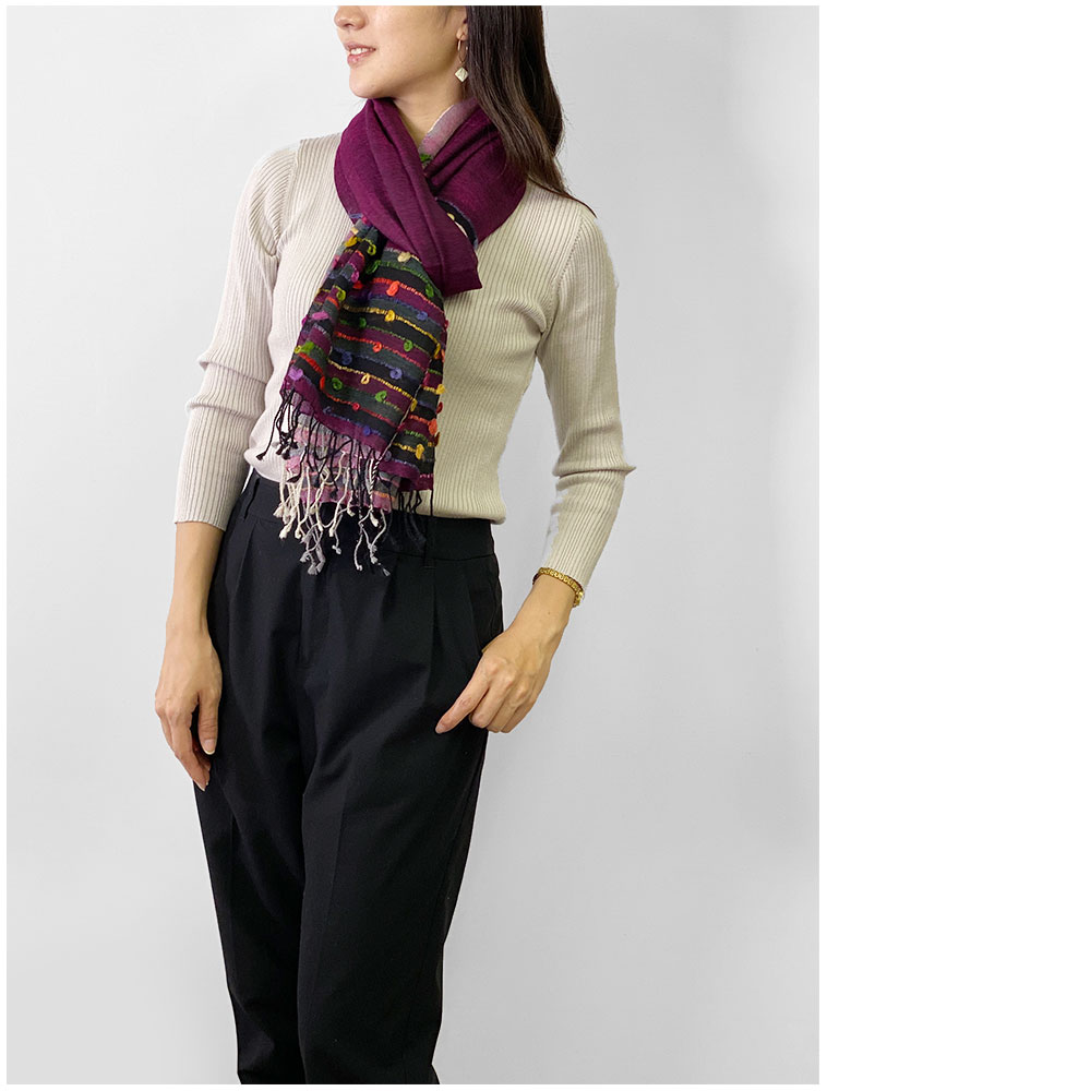 | 薄手で軽い巻き心地のウールストールです。 ストールが3色の糸で織られており、畳み方によって3色楽しめます。 カラフルラインのドットに見える部分は、職人が手作業でウールの糸をつまんで丁寧に作られたもの。 ここでしか出会えない希少なストールを是非ご堪能ください。 |