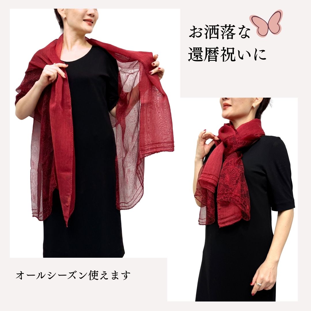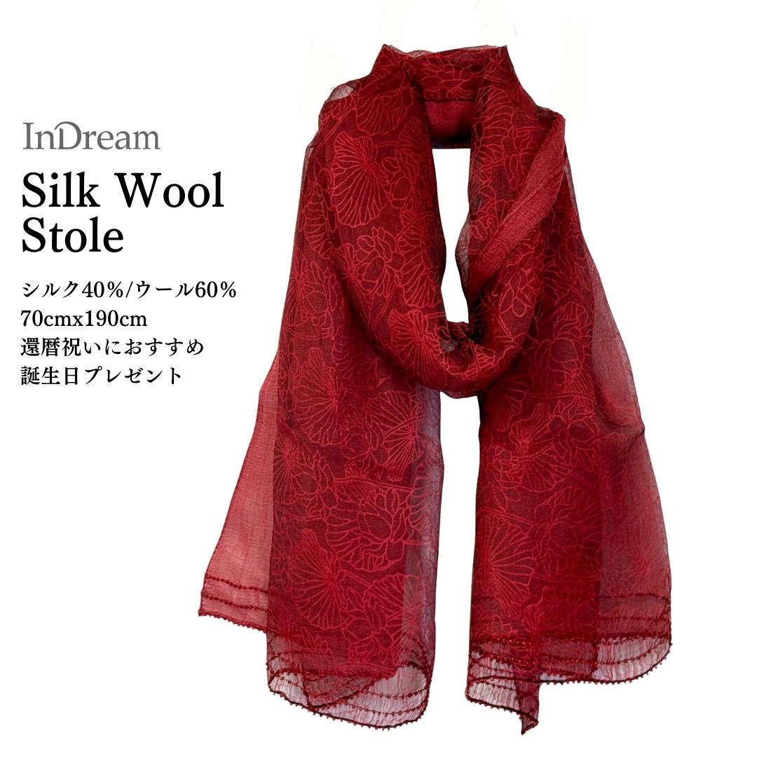 InDream シルクウール ストール オーガンジー 赤 レッド ビーズ 春 夏 秋 冬 スカーフ 大判 結婚式 パーティー ストール 誕生日 プレゼント 還暦祝い 母の日 母の日 ギフト 50代 60代 70代 80代