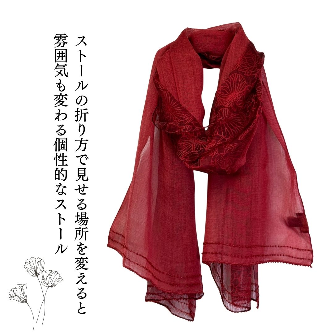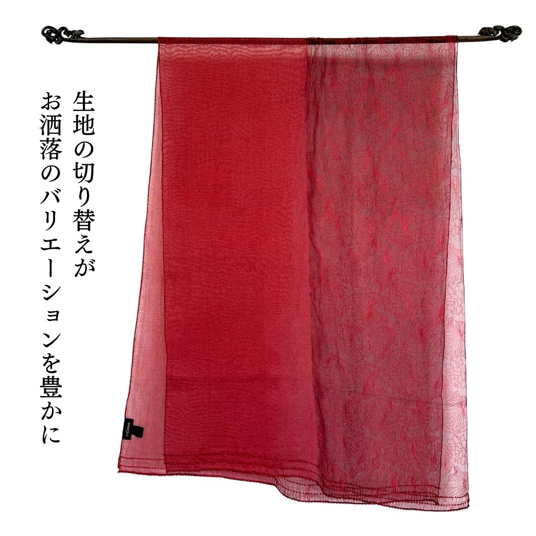 左右で異なるカラーと質感の基布を使用し、花模様のプリントが透かしの様で軽やか。 細部までこだわった作りで、ビーズは手刺繍で施されています。 カジュアルにもパーティーにも使える巻き方次第で印象が変わる使いやすいストールです。 ストール専門店ならではの品揃えです。 |